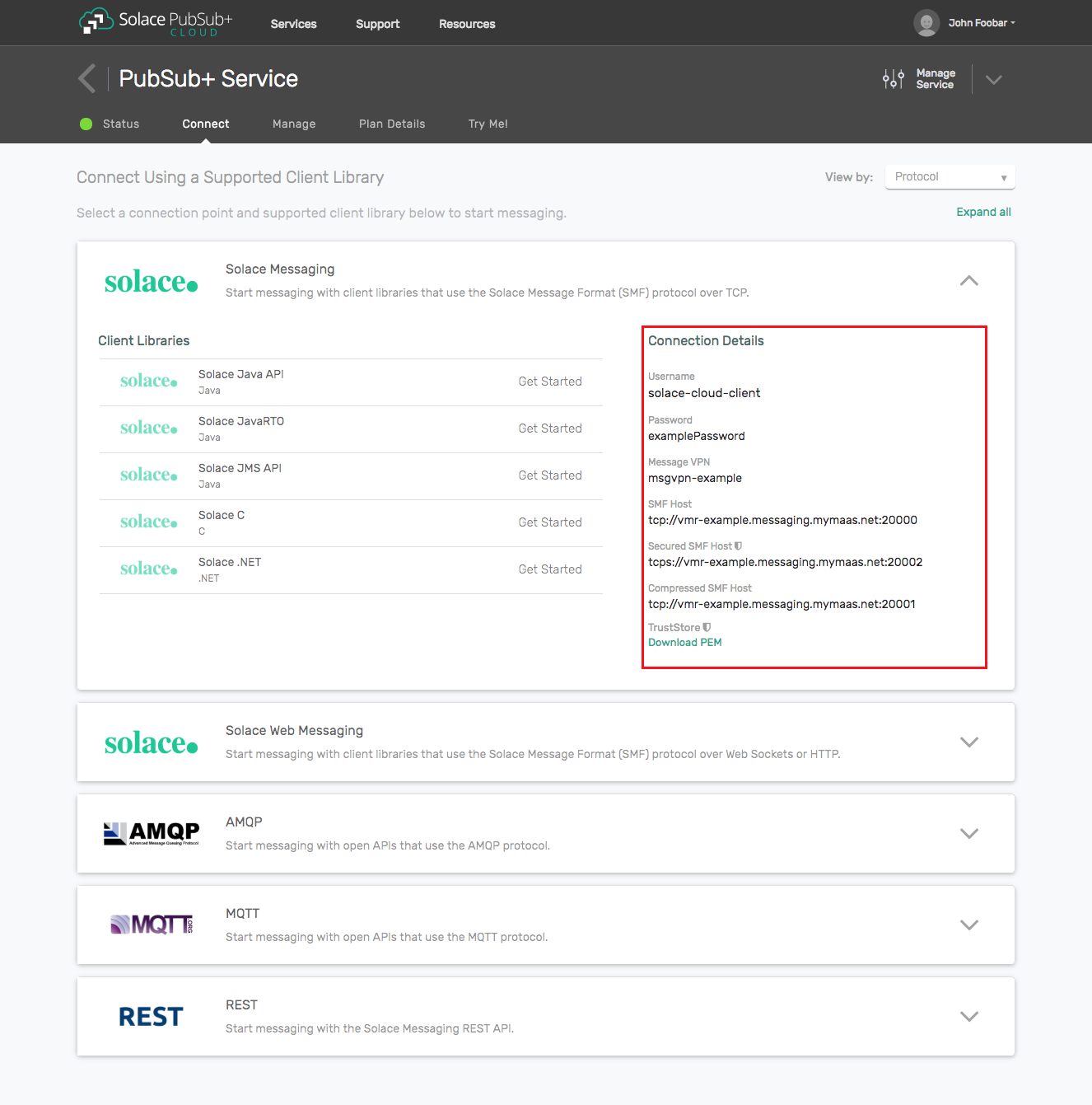 Refer to section 2- Get Solace Messaging for values